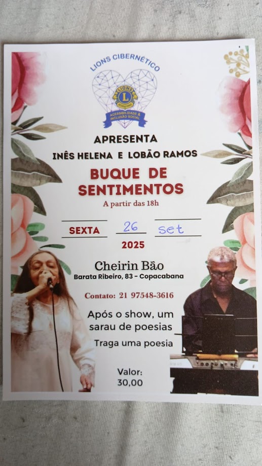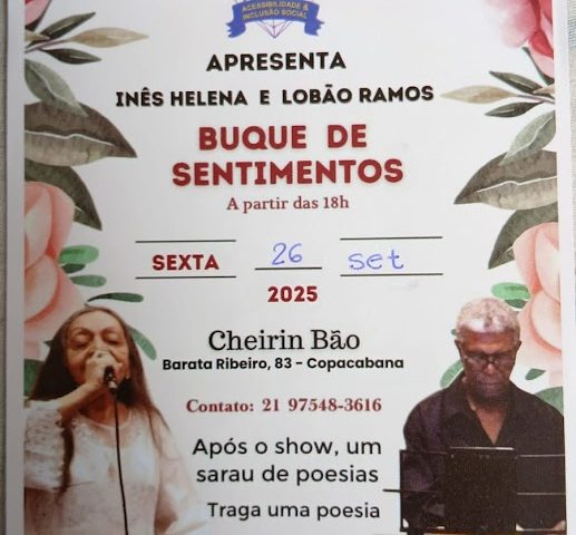 Em Copacabana, no Bar Cheirim Bão, novamente se apresenta a cantora e poetisa Inês Helena ao lado do músico Lobão Ramos com o show “Buque de Sentimentos”.
