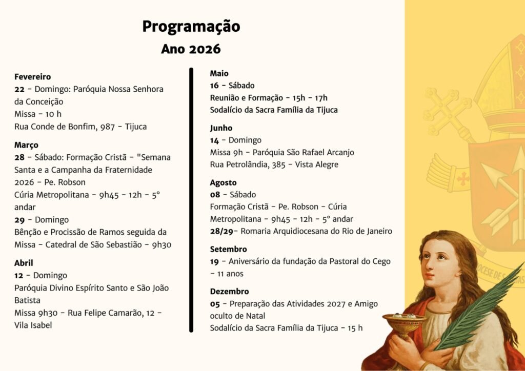 Segue a Programação do ano de 2026, bem com a Equipe de Liderança da Pastoral e os endereços importantes:
